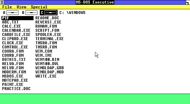 Windows 1.01, випущена в листопаді 1985 року, працювала поверх MS-DOS і мала вкрай скромні вимоги: процесор Intel 8088, 256 КБ оперативної пам’яті, два дисководи для гнучких дисків та графіку CGA, причому миша була лише рекомендованим, а не обов’язковим елементом — що добре ілюструє технічний рівень перших версій Windows.
