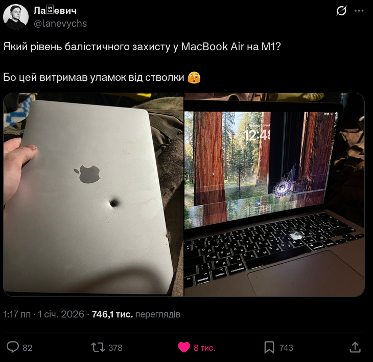 Автор допису іронічно підписав публікацію фразою «Який рівень балістичного захисту у MacBook Air на M1?», пояснивши, що ноутбук витримав уламок від ствольної зброї, чим і спровокував хвилю жартів та обговорень у мережі, а сама історія швидко перетворилася на вірусний приклад неочікуваної міцності техніки від Apple.