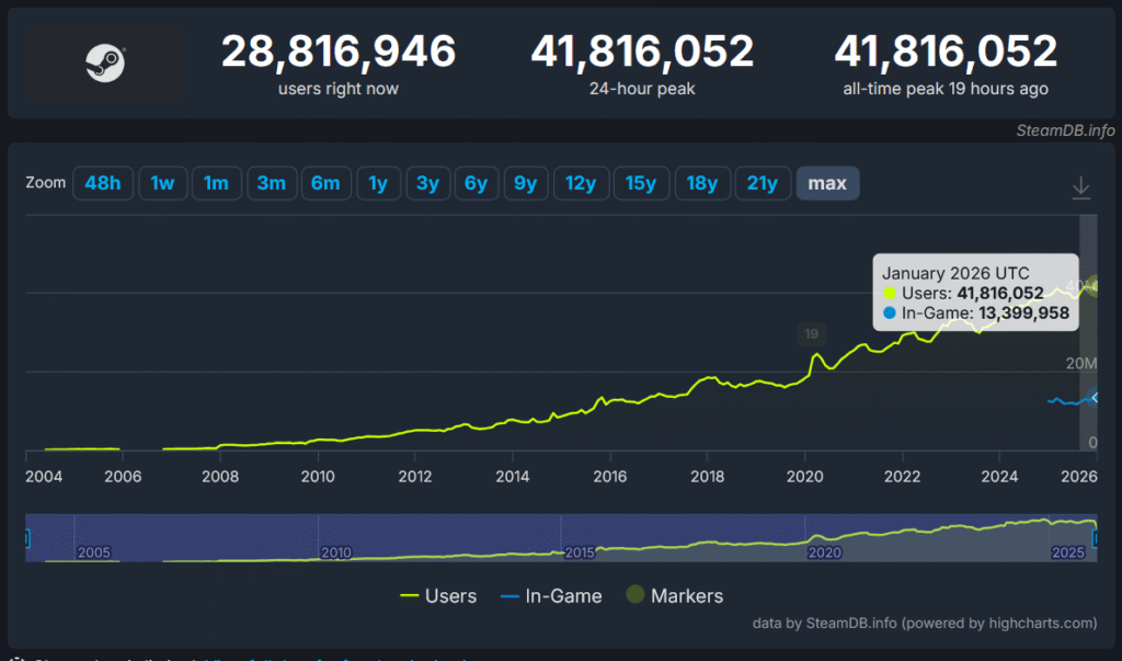 За оновленими даними, піковий онлайн Steam досяг 41 816 052 одночасних користувачів, що приблизно на 200 тисяч перевищує попередній рекорд, встановлений у жовтні. Таким чином платформа не лише оновила історичний максимум, а й упевнено перевершила минуле досягнення, підтвердивши подальше зростання своєї аудиторії.
