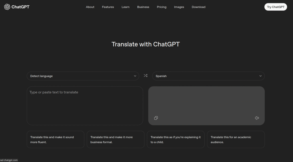 ChatGPT Translate – це окремий режим перекладу в екосистемі ChatGPT, який працює як самостійний інструмент і не потребує запуску звичайного діалогу. Він дозволяє перекладати текст різними способами: шляхом ручного введення, вставлення готового фрагмента, завантаження файлів, використання голосу або зображень, а також підтримує автоматичне визначення мови чи ручний вибір мовної пари. Переклад виконується миттєво, без додаткових налаштувань і доступний усім користувачам без платної підписки.