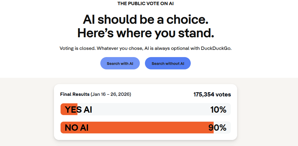 Пошукова система DuckDuckGo, відома за свою конфіденційність, провели відкрите голосування серед користувачів щодо використання штучного інтелекту в пошуку. Результат виявився однозначним: переважна більшість аудиторії не хоче бачити AI у видачі результатів. Про це пише PCMag.