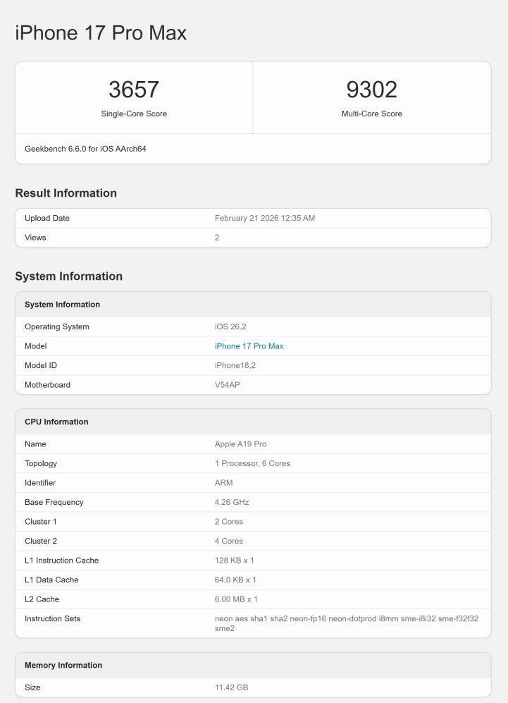 За даними тесту Geekbench 6, Samsung Galaxy S26 Ultra набрав:
