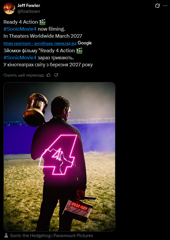 Зйомки «Їжака Соніка 4» офіційно стартували. Про це повідомив режисер Джефф Фаулер, який працював над усіма частинами кінофраншизи. Виробництво розпочалося приблизно за рік до запланованої прем’єри – реліз фільму очікується у березні 2027 року.