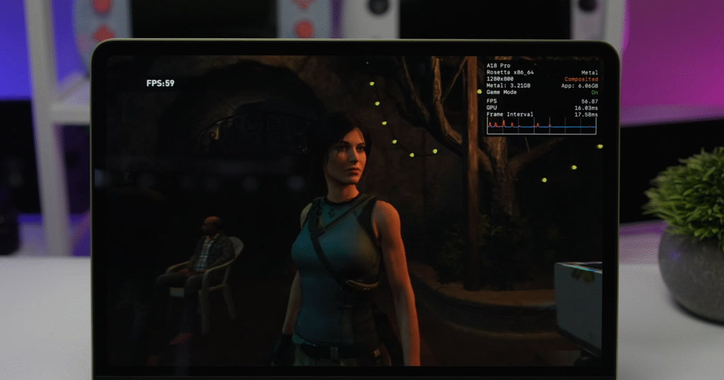 MacBook Neo також протестували в інших вимогливих проєктах, зокрема RoboCop: Rogue City та Shadow of the Tomb Raider: в обох випадках ноутбук демонструє стабільні 40–45 FPS при роздільній здатності близько 720p із використанням апскейлінгу для покращення якості зображення, що свідчить про здатність пристрою впевнено працювати не лише з окремими оптимізованими іграми, а й із ширшим переліком сучасних релізів.