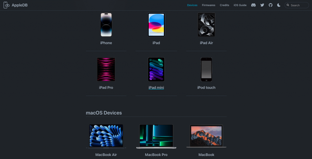 Ентузіасти з GitHub розробили інтернет-ресурс під назвою AppleDB, який збирає в собі детальну базу даних всіх пристроїв, що були випущені корпорацією Apple, включаючи докладні технічні характеристики, ідентифікаційні номери моделей, а також версії їхнього програмного забезпечення.
