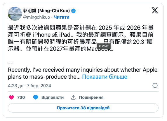 Мін-Чі Куо, відомий своїми точними прогнозами щодо продуктів Apple, звернув увагу на зростаючий інтерес до технології складаних екранів і як це може вплинути на майбутнє портативних пристроїв. За його словами, нова модель MacBook не просто включатиме інноваційний дизайн, а й забезпечить новий рівень функціональності та портативності, який раніше був недосяжний для традиційних ноутбуків.