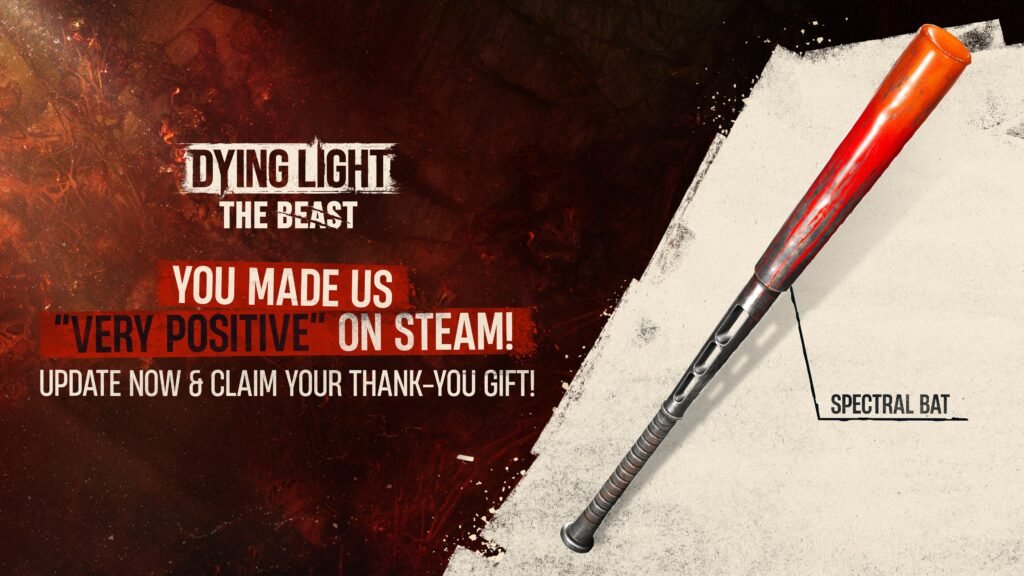 «Ви неймовірні! Завдяки понад 8 тисячам відгуків та 90% рекомендацій Dying Light: The Beast отримала рейтинг “Дуже схвальні”. Як знак вдячності ми даруємо вам спеціальну зброю — Spectral Bat. Просто оновіть гру і насолоджуйтеся нагородою».