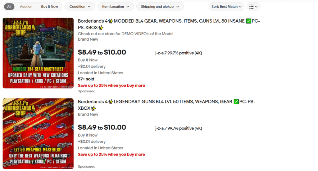 Перегляд завершених лотів на eBay показує, що попит на подібні предмети справді існує: легендарна зброя та спорядження продаються за $3–10, а повністю «прокачані» персонажі оцінюються у $30–55. Втім, навіть за таких цін продажі не приносять продавцям відчутного прибутку.