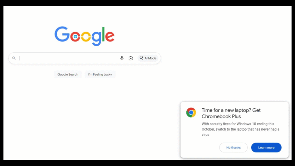 У оголошені Google попереджає, що оновлення безпеки Windows 10 завершуються у жовтні 2025 року, закликаючи користувачів «час для нового ноутбука? Оберіть Chromebook Plus» та обіцяючи «ноутбук, який ніколи не мав вірусів». При натисканні на «Дізнатися більше» відкривається сторінка Switch to Chromebook зі слоганом «Goodbye PC. Hello Chromebook».
