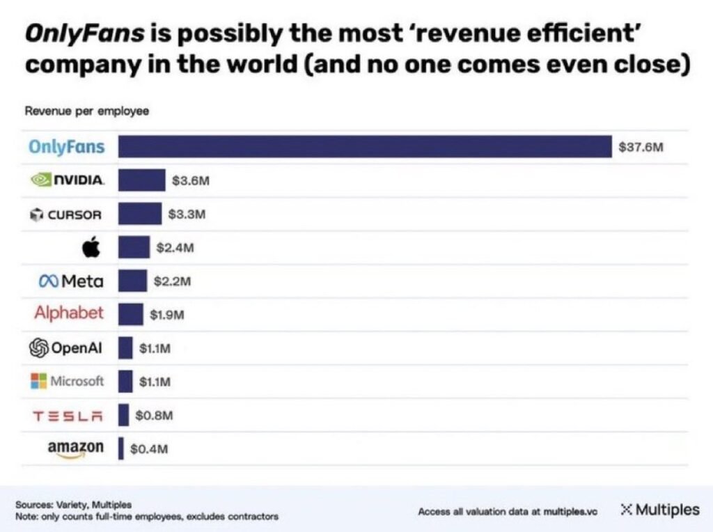 Таким чином, ефективність OnlyFans перевищує результати найбільших технологічних корпорацій у 10–30 разів, попри те що її бізнес-модель набагато простіша та менш капіталомістка.