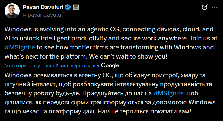 Як повідмоляє Windows Central, у дописі Давулурі йшлося про Microsoft Ignite та про те, як клієнти використовують Windows як базу для AI-рішень. Однак ключове повідомлення — курс на трансформацію Windows у агентну ОС, де ШІ стане центральним елементом взаємодії.