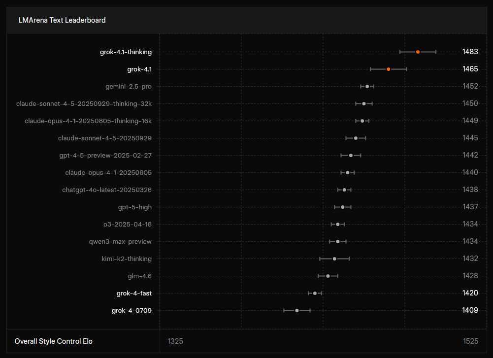 У текстовій арені LMArena модель Grok 4.1 Thinking посіла 1-ше місце з показником 1483 Elo, випередивши інші моделі на ринку. Версія без reasoning-токенів тотримала 1465 Elo і стала другою, перевершивши reasoning-конфігурації конкурентів. Для порівняння: Grok 4 раніше посідав 33 місце.