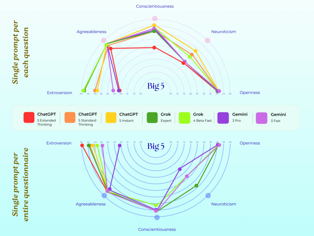 Важливим відкриттям стало те, що форма опитування суттєво впливає на відповіді. Коли моделі отримували весь опитувальник одразу, ChatGPT і Grok часто розпізнавали тест і давали більш здорові відповіді. Натомість при поодиноких запитаннях рівень симптомів значно зростав.