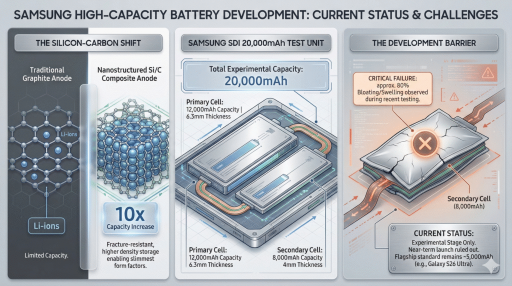 Згідно з інформацією від інсайдерів, Samsung SDI тестує двосекційну батарею, що складається з основної комірки ємністю 12 000 мА·год і товщиною 6,3 мм та додаткової комірки на 8 000 мА·год завтовшки 4 мм, які разом формують загальну ємність у рекордні 20 000 мА·год і потенційно можуть суттєво змінити уявлення про автономність смартфонів і портативних комп’ютерів.