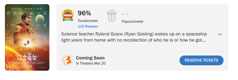 Новий науково-фантастичний фільм Проєкт «Аве Марія» із Ryan Gosling у головній ролі отримує дуже високі оцінки від кінокритиків. На агрегаторі рецензій Rotten Tomatoes стрічка набрала 96% позитивних відгуків на основі понад сотні рецензій, що робить її одним із найкраще оцінених фільмів 2026 року.